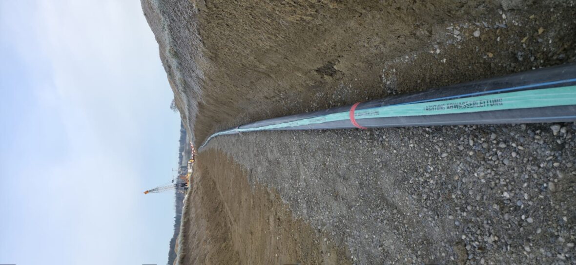 Weiter wurden ca. 280m Trinkwasserrohre mit einem Innendurchmesser von 400mm verlegt, welche im Endausbau das Pumpwerk mit der Transportleitung verbinden. Für die Entsorgung von anfallendem Schmutzwasser wurde eine ca. 230m lange Pumpendruckleitung (Doppelrohsystem, Rohr in Rohr) verlegt.