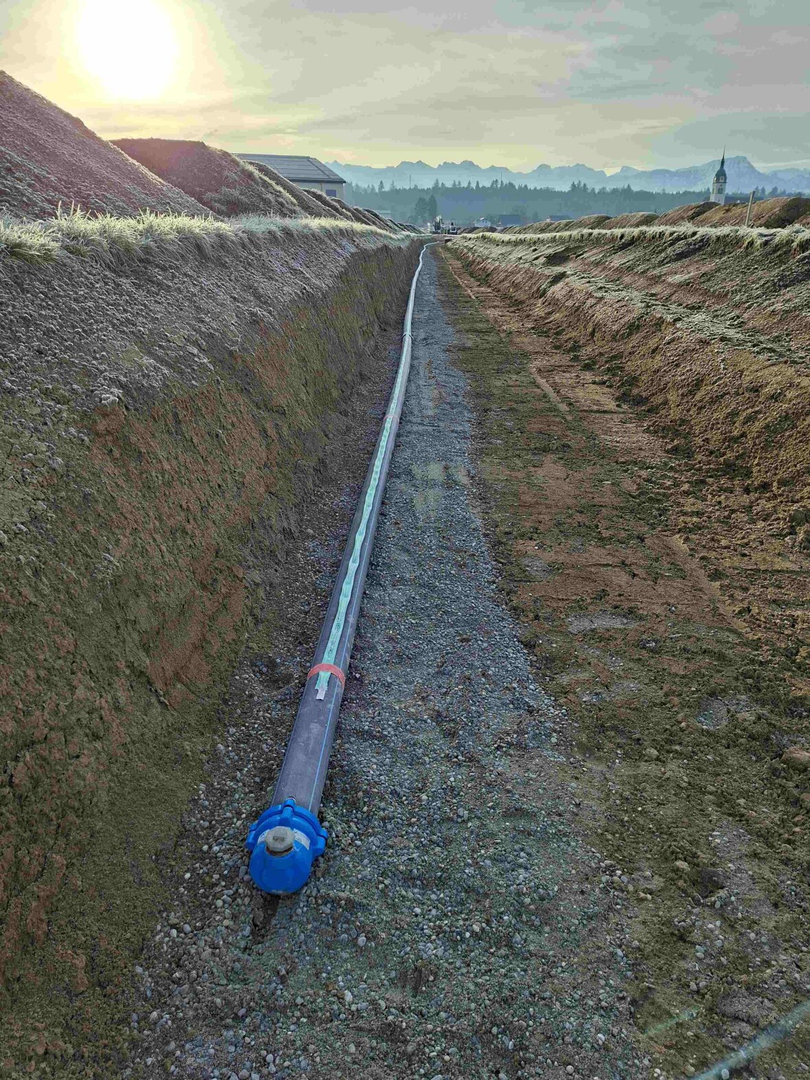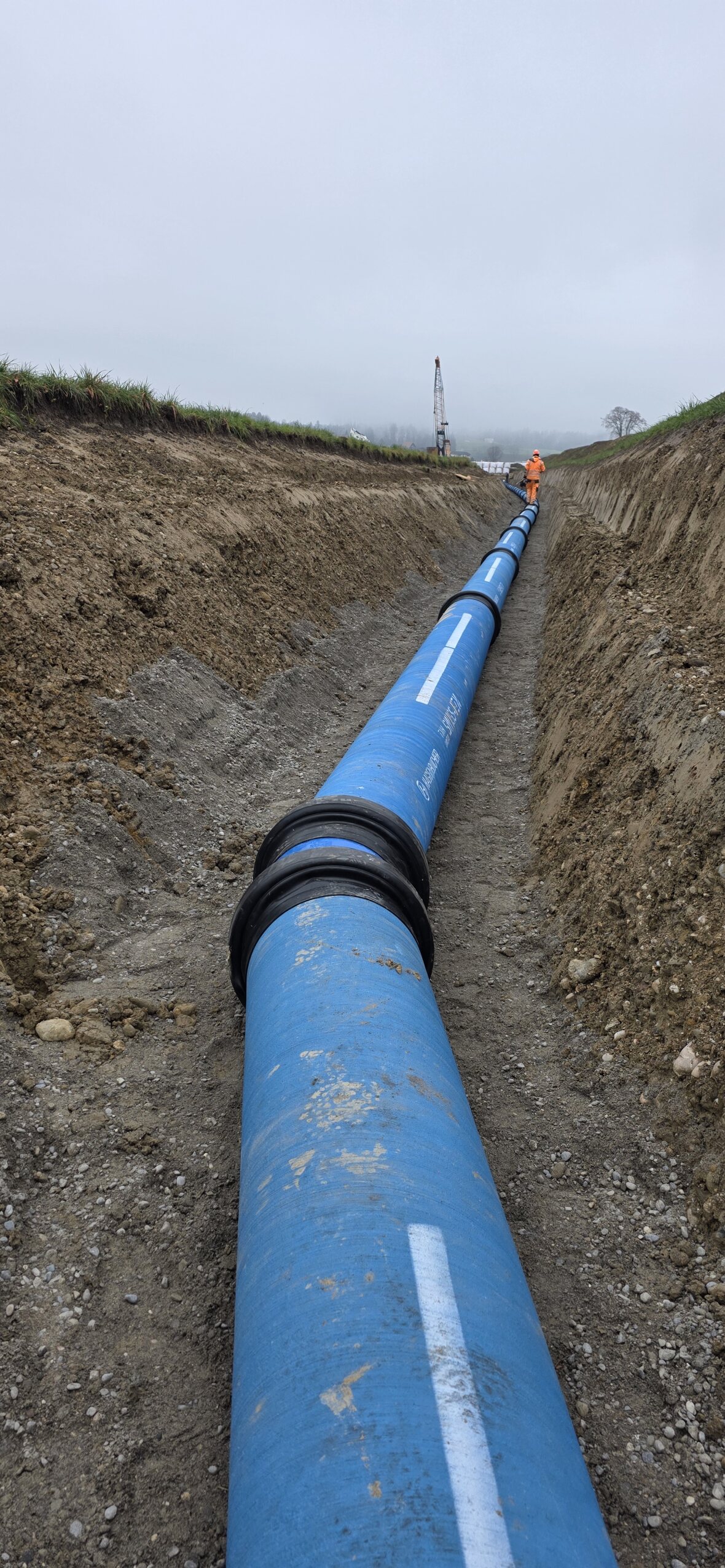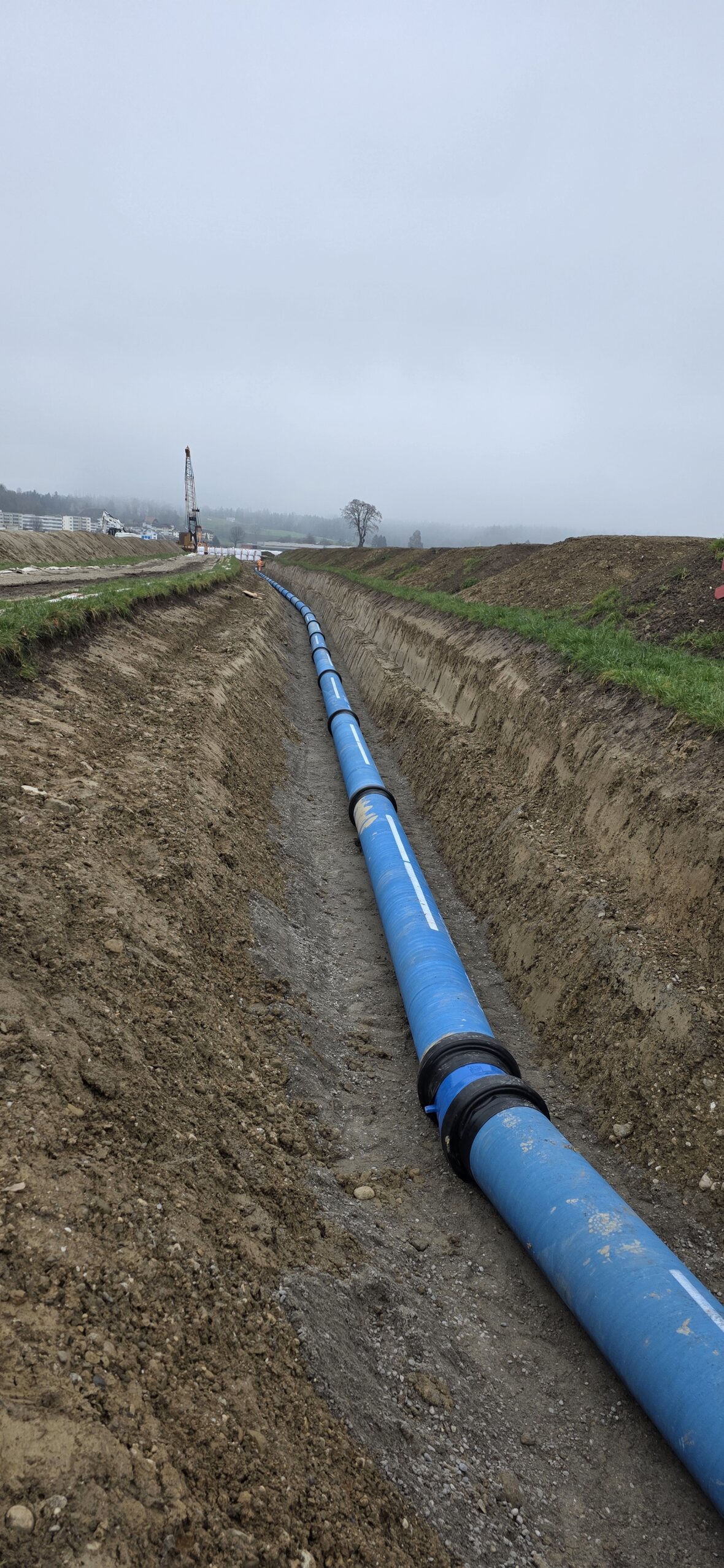 Weiter wurden ca. 280m Trinkwasserrohre mit einem Innendurchmesser von 400mm verlegt, welche im Endausbau das Pumpwerk mit der Transportleitung verbinden. Für die Entsorgung von anfallendem Schmutzwasser wurde eine ca. 230m lange Pumpendruckleitung (Doppelrohsystem, Rohr in Rohr) verlegt.